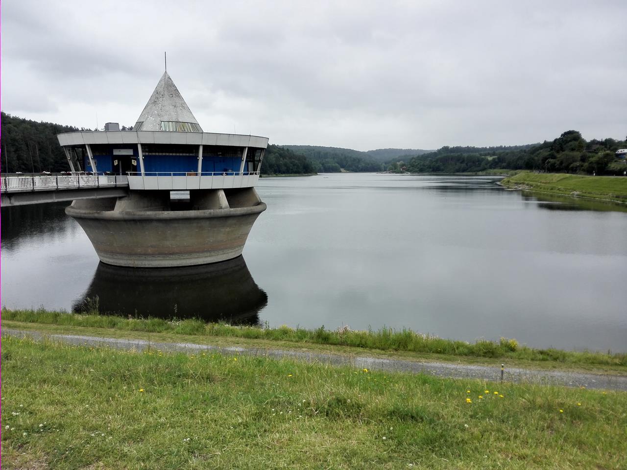 Der markante Überlauftrichter des Sees mit einem Café auf der Spitze