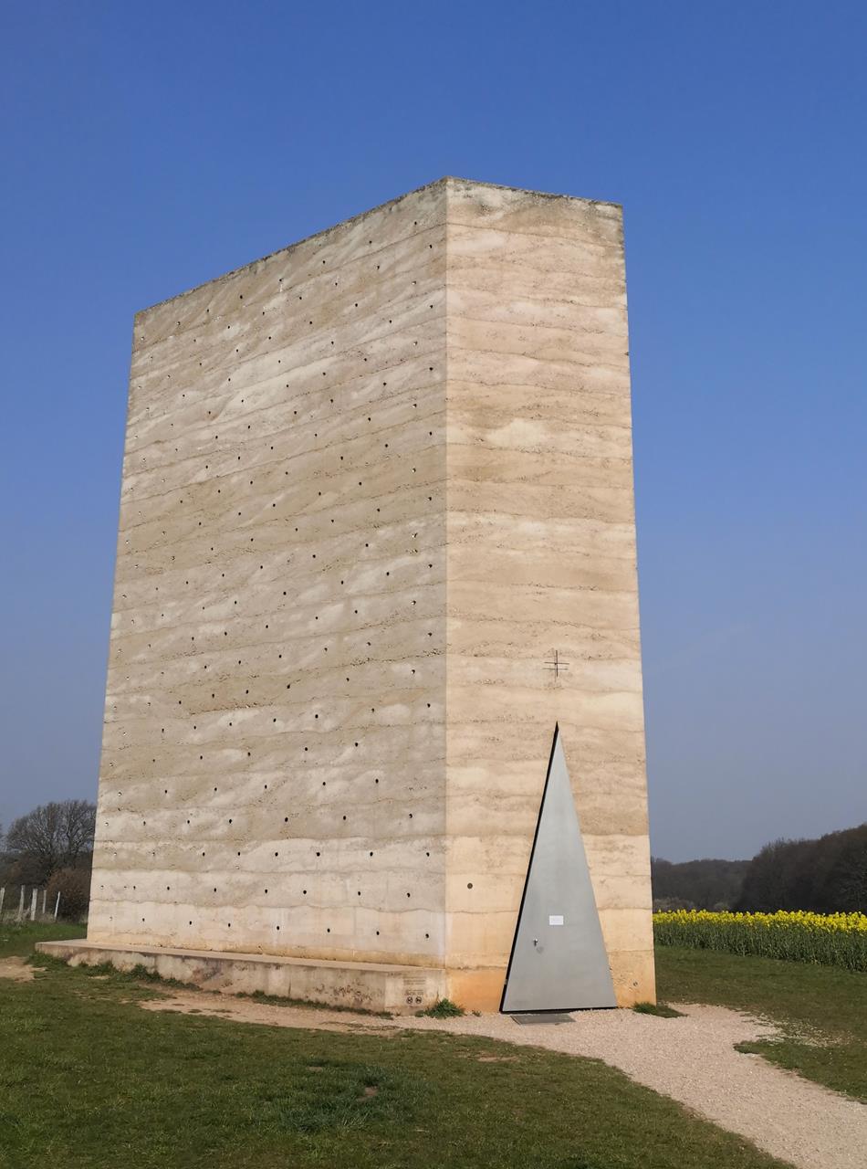 Vorne die dreieckige Eingangstür