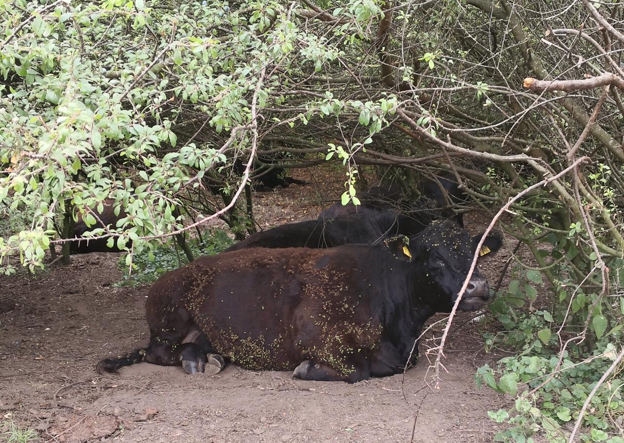 arcen_aug_2019_021_1280x910 ← Zurück Weiter → Ur-Rinder auf den Weideflächen an der Maas. Auch ihr Fell hängt voller Kletten.
