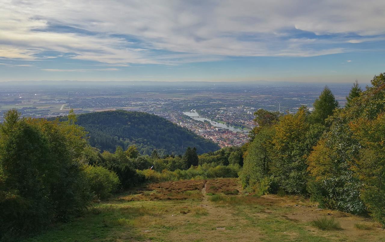 Weiter → Blick vom Königstzhl hinunter nach Heidelberg und in das Rheintal. Im Hintergrund: Der Pfälzer Wald.