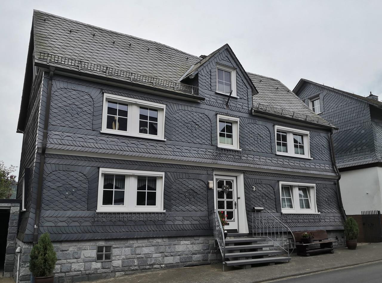 bad_berleburg_mai_2020_038_1280x949 ← Zurück Weiter → Auffallend die aufwändig gearbeitete und mit Verzierungen versehene Schieferverkleidung vieler Häuser