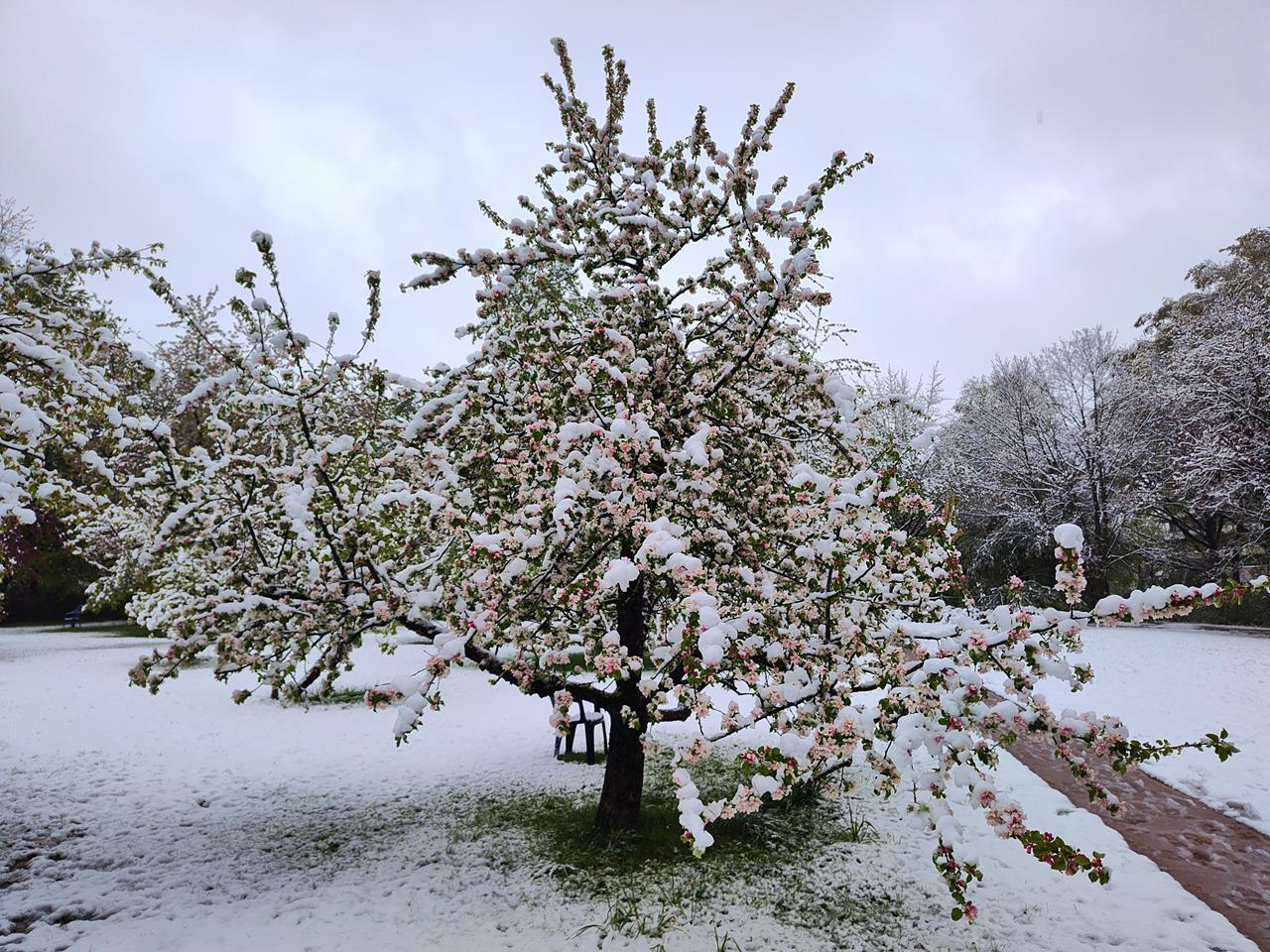 Blühender Apfelbaum unter Schnee