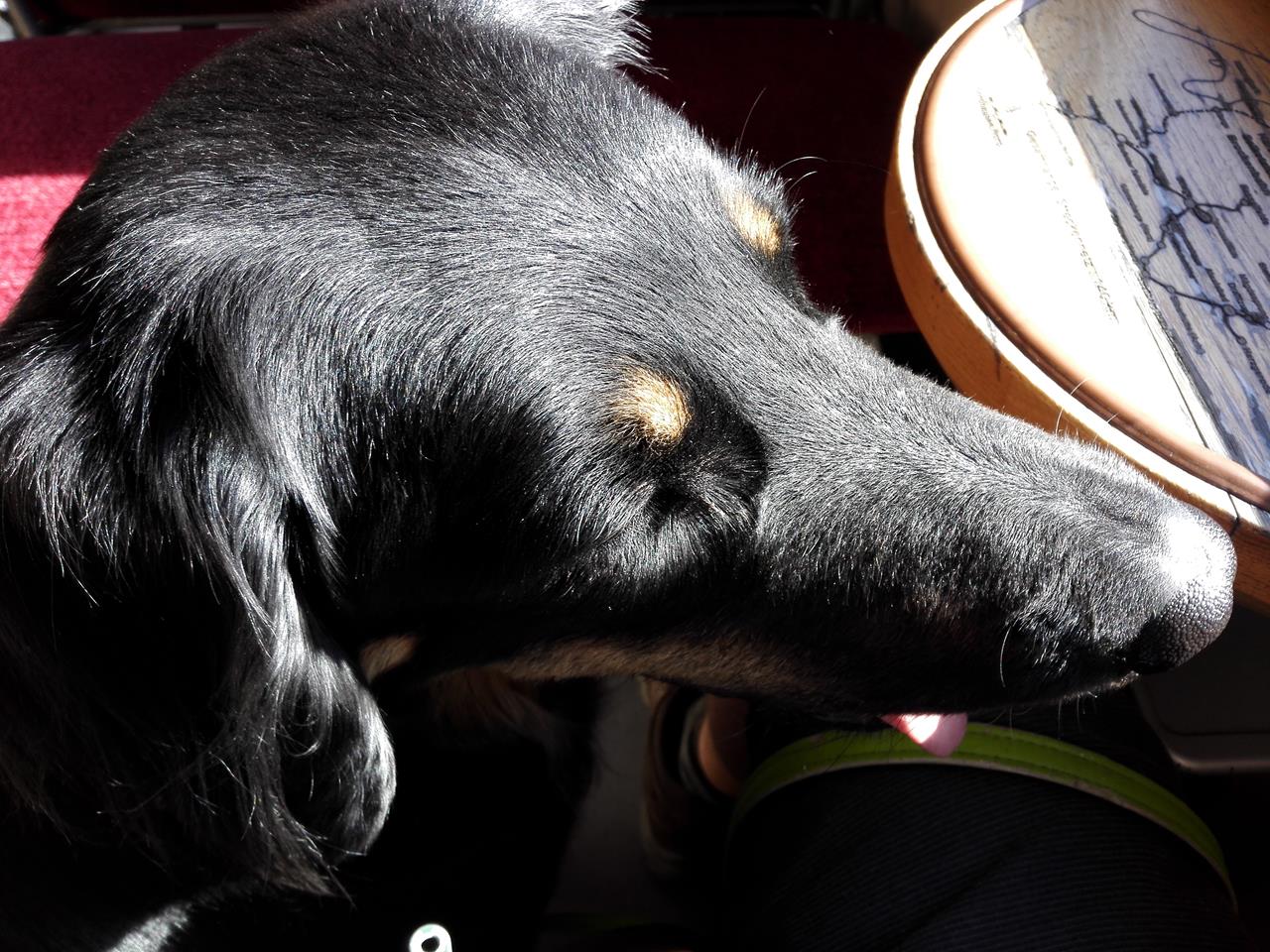 Im Zug: Doxi schaut aus dem Fenster