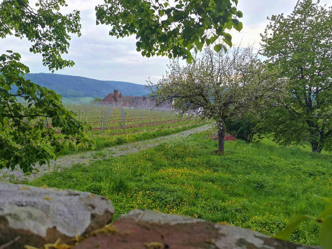 Blick in den großen ummauerten Klosterbereich mit eigenem Weinberg