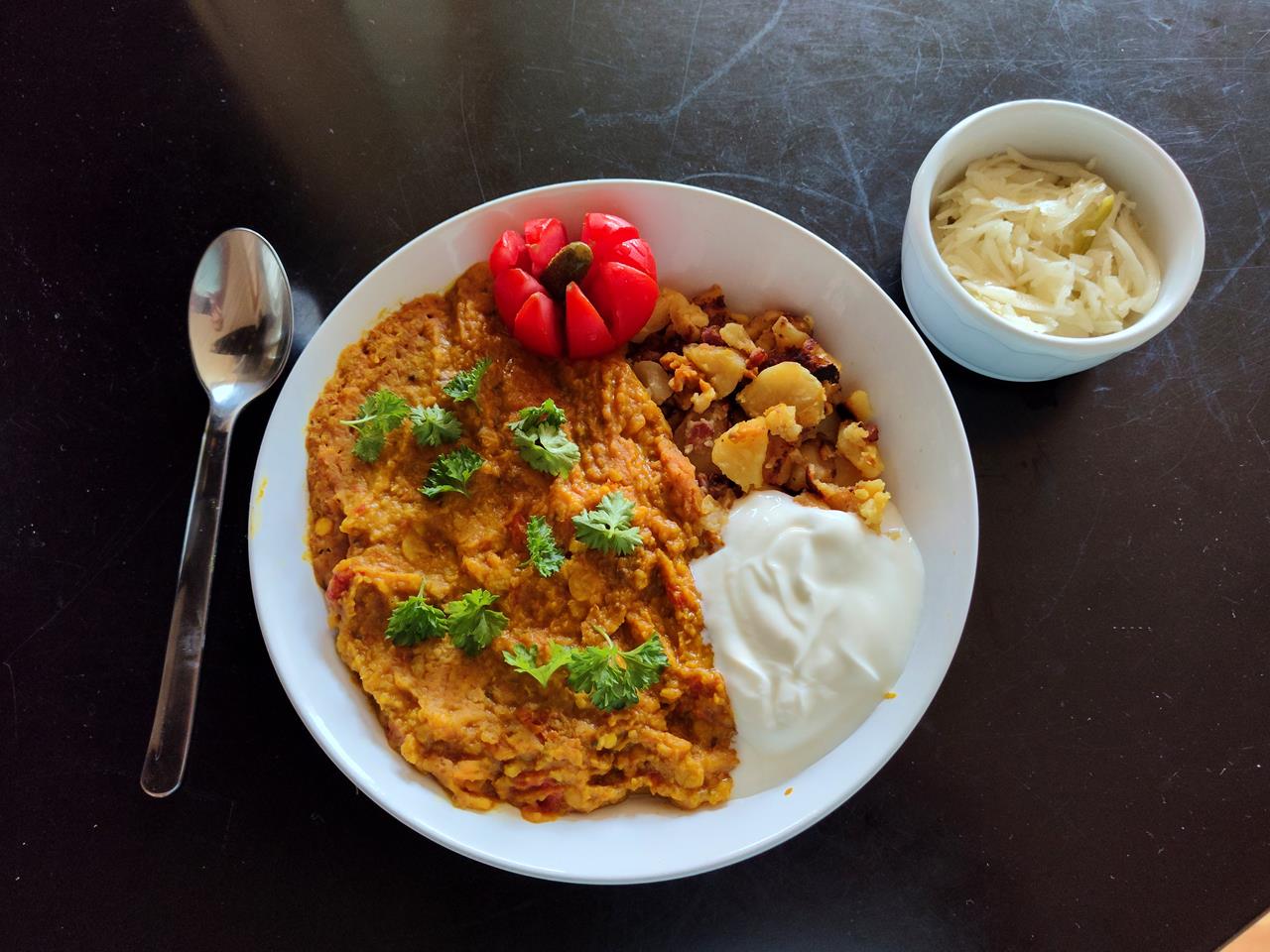 Das fertige Dal mit Bratkartoffeln und Joghurt