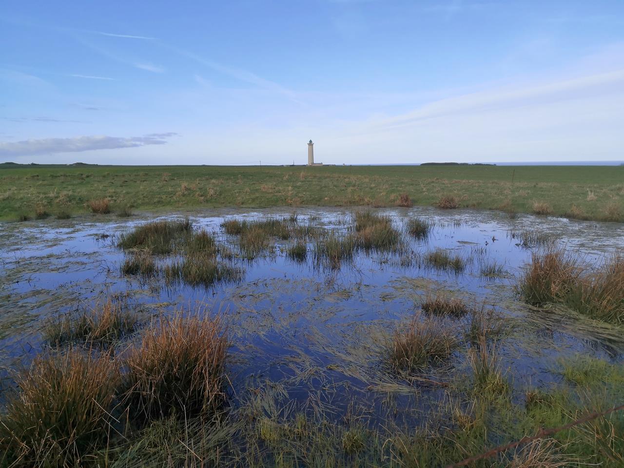 Blick über Salzwiesen zum Leuchtturm