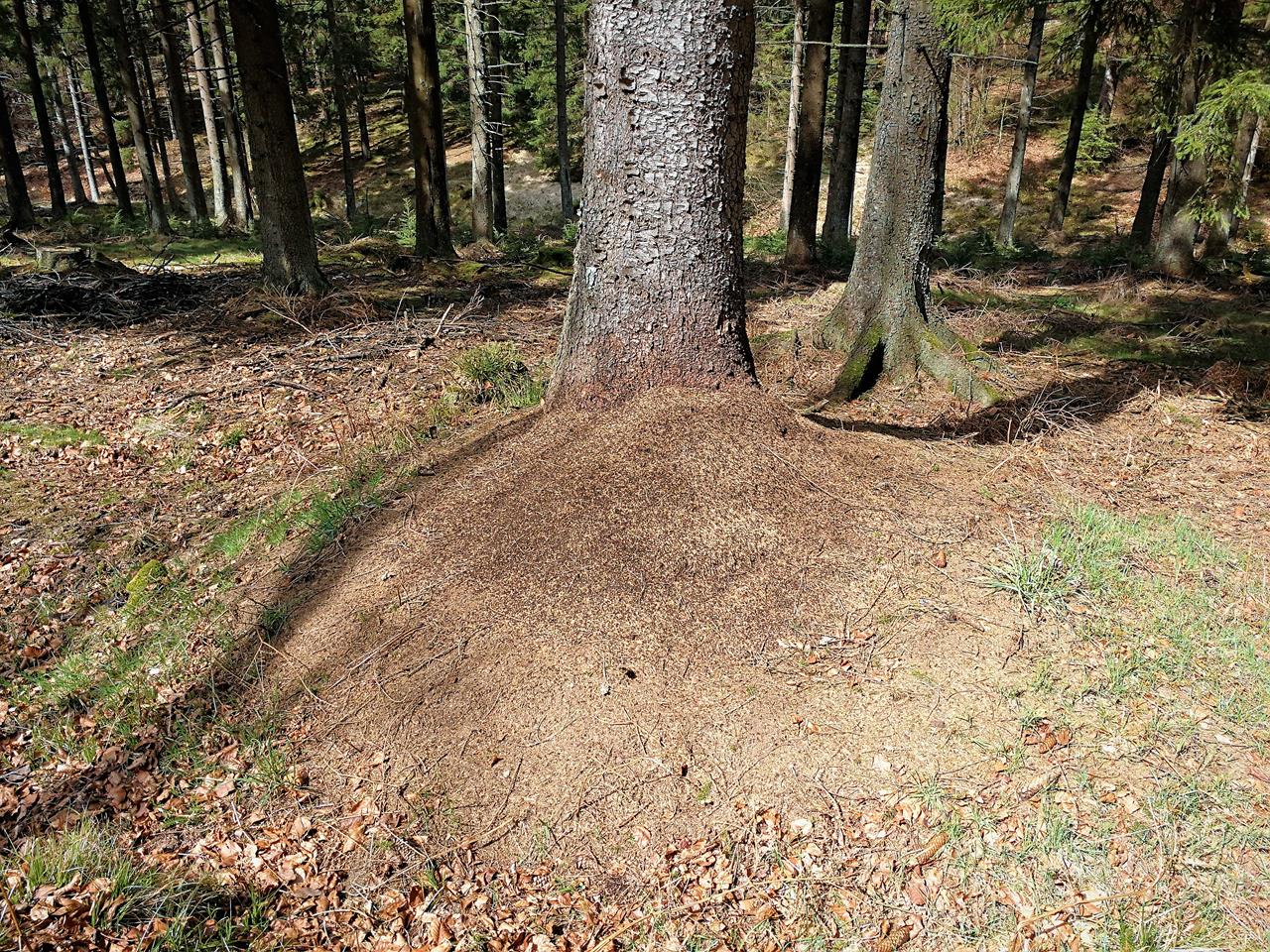 ← Zurück Weiter → Am Wegesrand zahlreiche große Ameisennester, auf denen tausende von Ameisen in der warmen Frühlingssonne herumwuseln