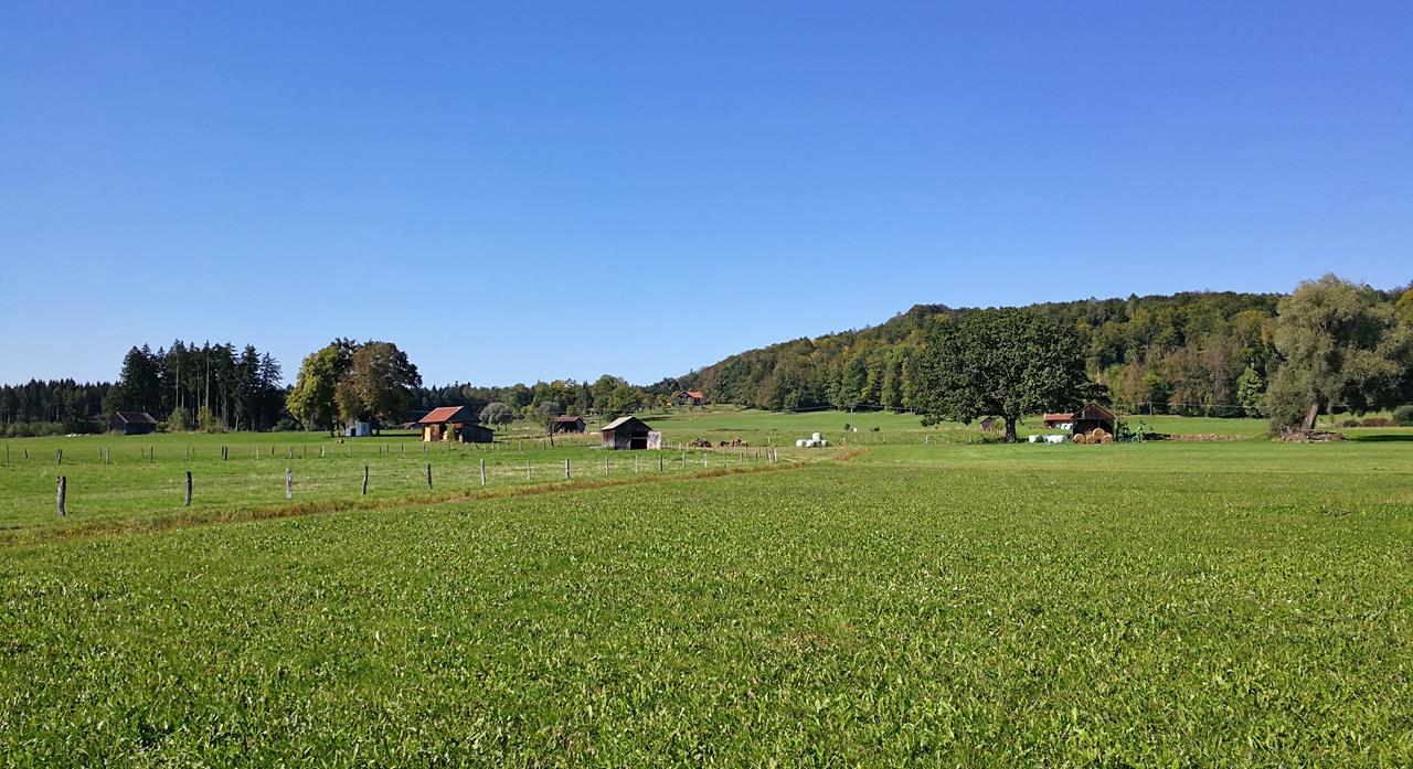 Heuschober durchziehen die Wiesenlandschaft