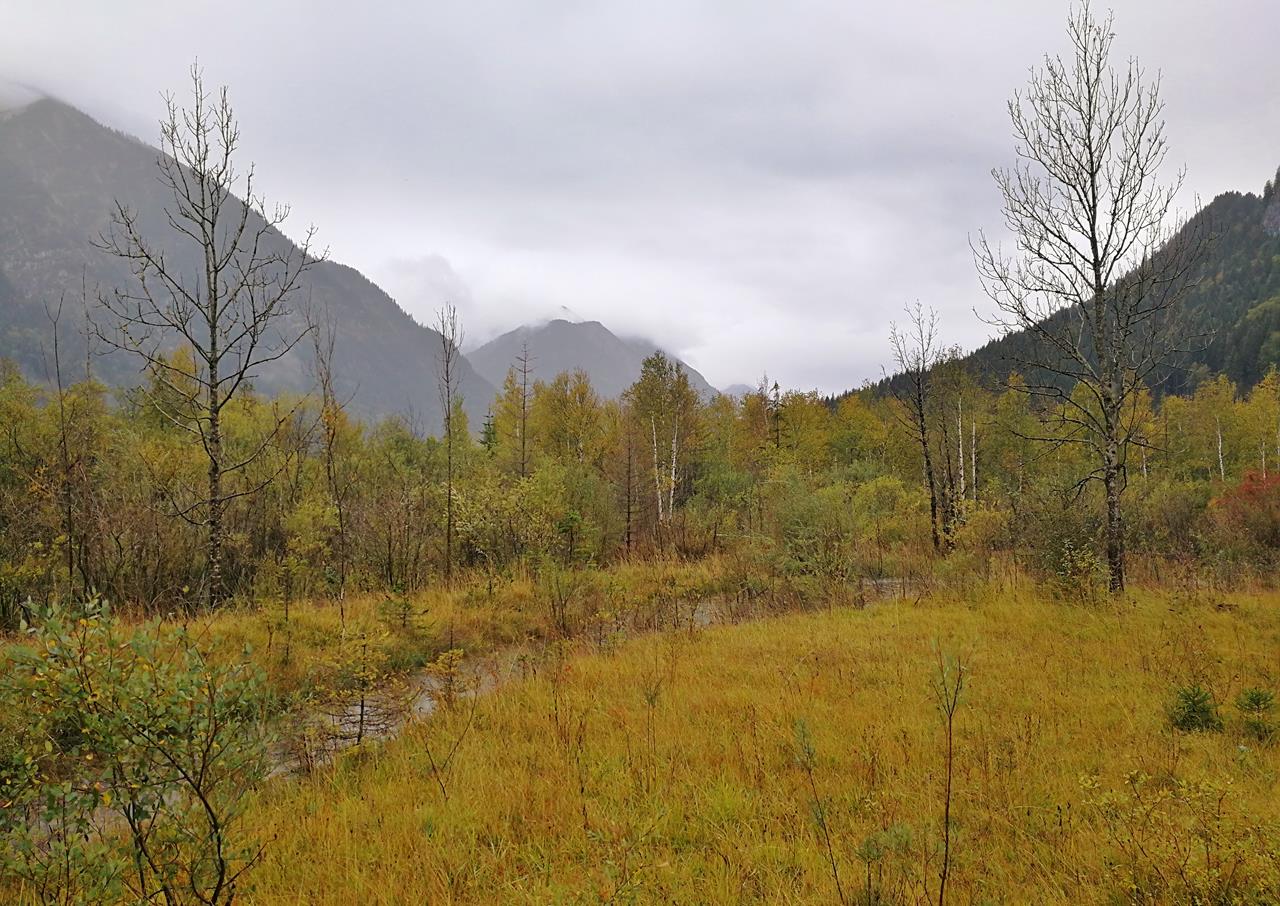 Blick zwischen den Bergen in Richtung des Ortes Graswang