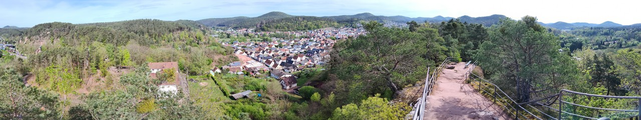 dahner_felsenland_apr_2025_024_1280x241 ← Zurück Weiter → Panoramabild von Dahn. Aufnahme vom Wachtfelsen.
