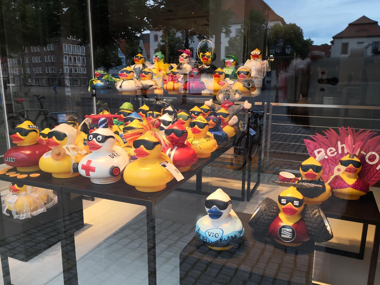 Invasion einer Armee der Entchen in einem Geschäft am Marktplatz
