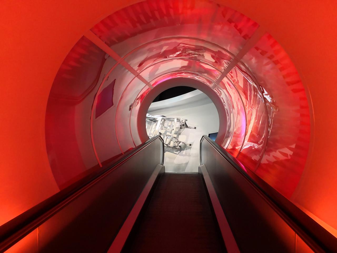 Auffahrt zur Präsentation der Fahrzeuge im Audi Pavillon durch einen Farbtunnel