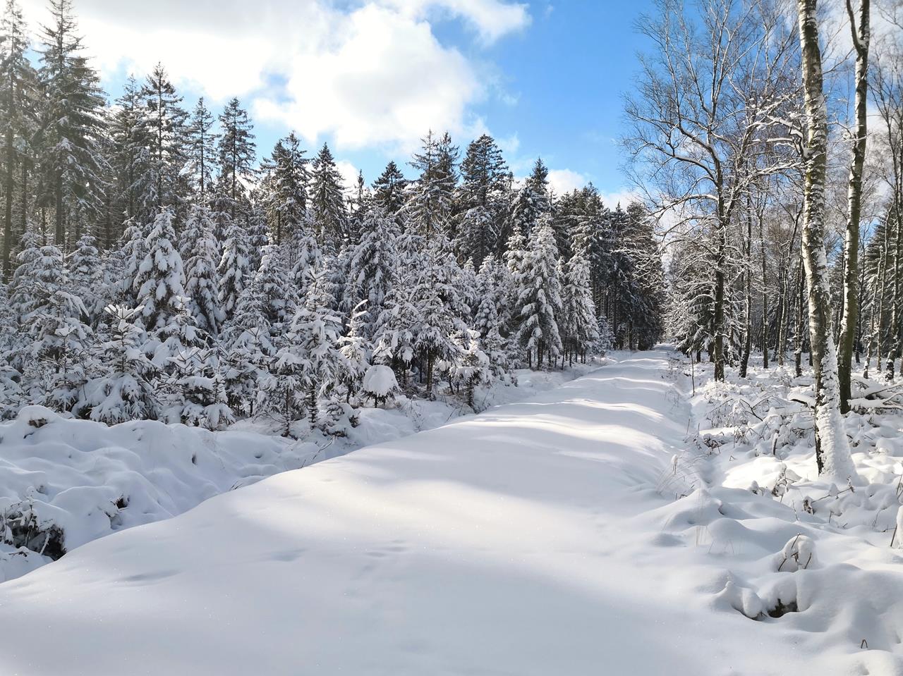 Auf einem Seitenweg sind wir die Ersten im frischen Schnee von Gestern