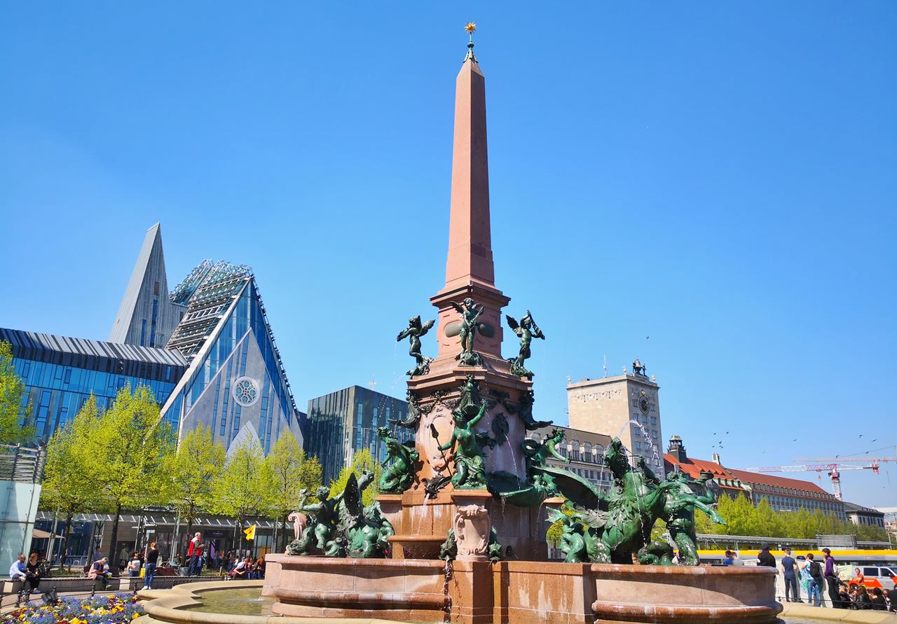 Der Mendebrunnen vor dem Gewandhaus und der Universitätskirche