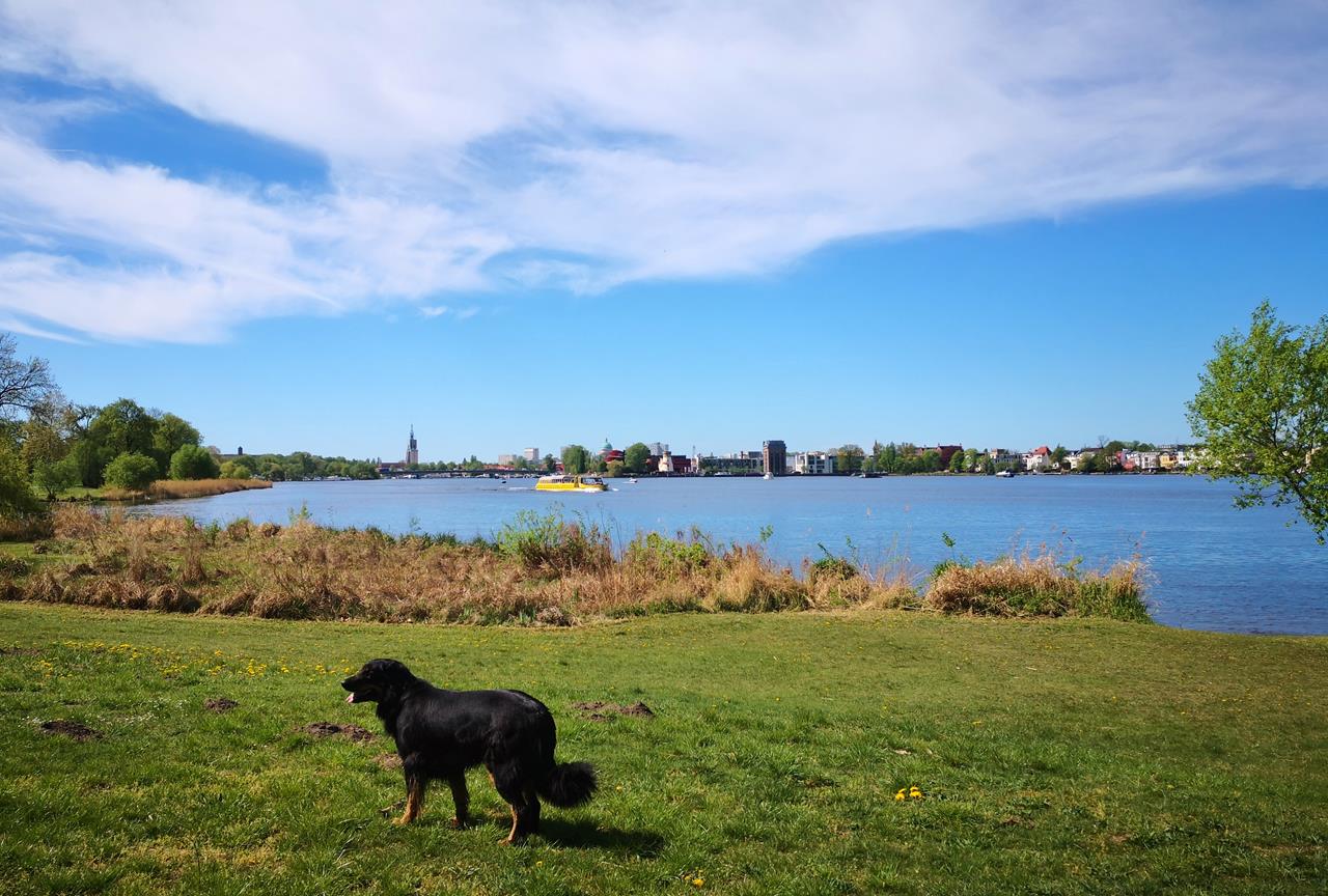 Doxi am Havel-Ufer im Park Babelsberg mit Blick auf die Skyline von Potsdam