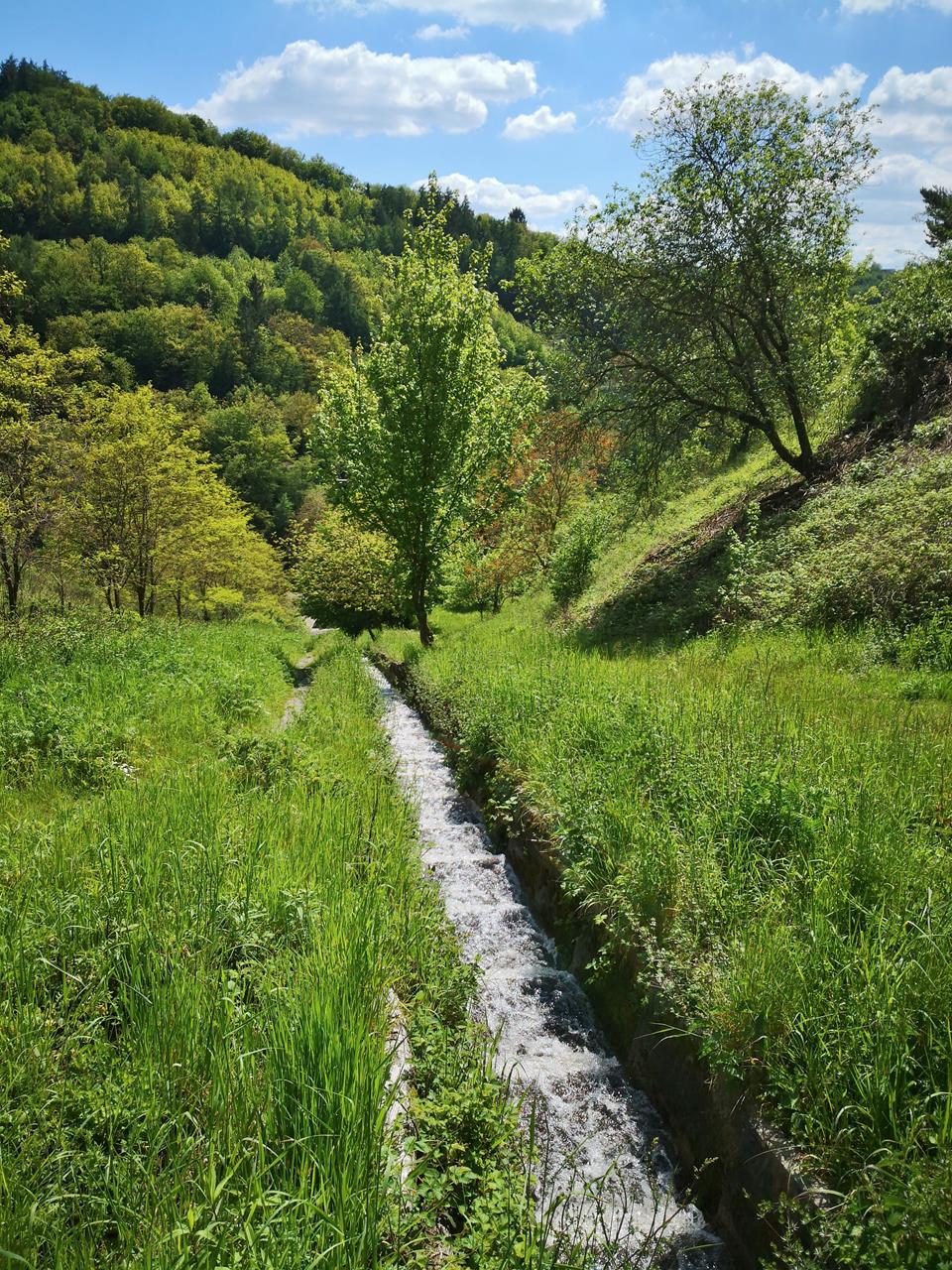 Kanalsiert strömt das Wasser aus den Höhenlagen zwischen den Weinbergen zu Tal