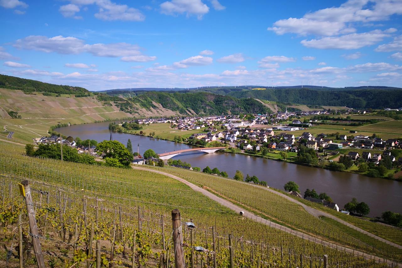 Blick auf Piesport und Alt-Piesport beim Aufstieg durch die Weinberge