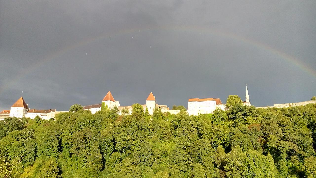 Auf den Regen folgt der Regenbogen. Blick vom Wöhrlsee hinauf zur Burg Burghausen.