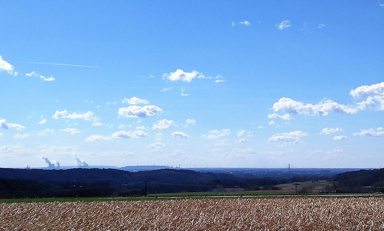 Eine Wanderung zwischen Frühling und Winter: Bei Erkrath laufen wir auf einer Länge von 12 Kilometern stetig bergauf und bergab durch drei Bachtäler und über die Höhen dazwischen. Die Sonne scheint, doch auf den Höhen bläst ein unangenehm kalter und starker Wind.