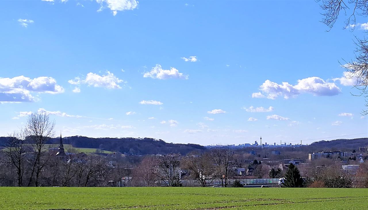 Blick von den Höhen auf Erkrarth, im Hinterrund die Skyline von Düsseldorf
