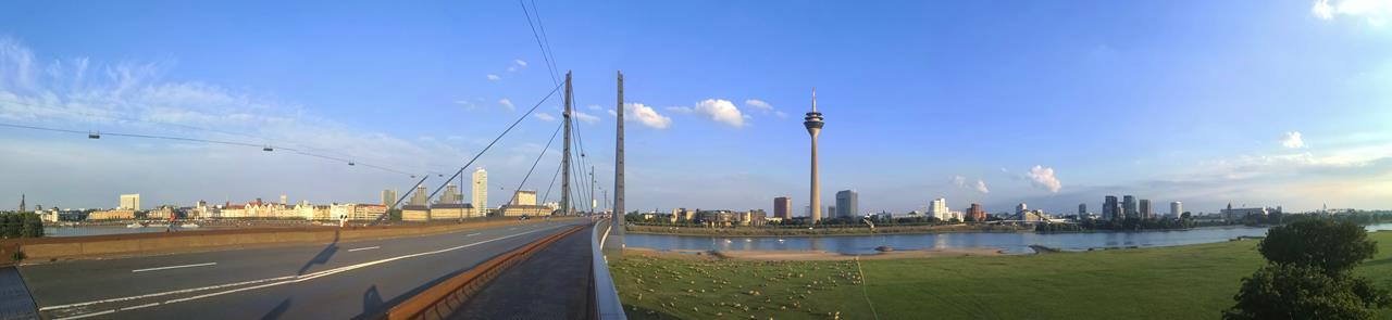 duesseldorf_jul_2020_007_1280x295 ← Zurück Weiter → Panoramablick auf das Zentrum von Düsseldorf von der Rheinknie-Brücke