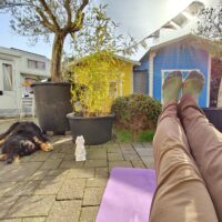 So kam Doxi zu ihrer zweiten Taxifahrt – diesmal allerdings ganz bequem auf ihrer Decke hinten im Auto und nicht wie in München bei mir auf dem Schoss. Am Stellplatz haben natürlich alle geschaut … „Wieso kommt der denn jetzt mit dem Taxi zurück?“