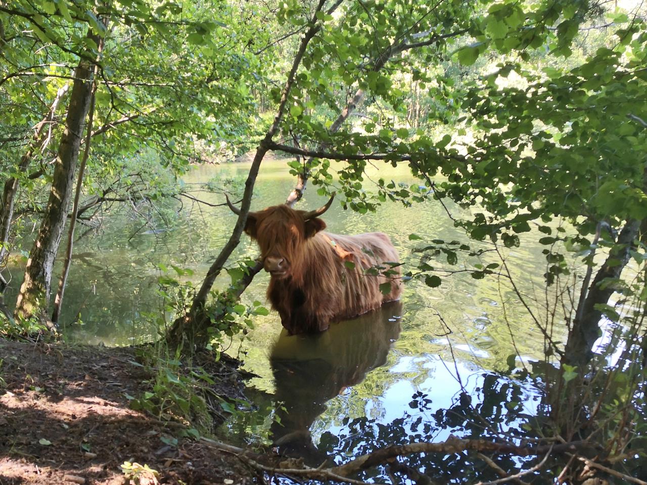 Dieses Rind weidet vom See aus junge Baumtriebe ab