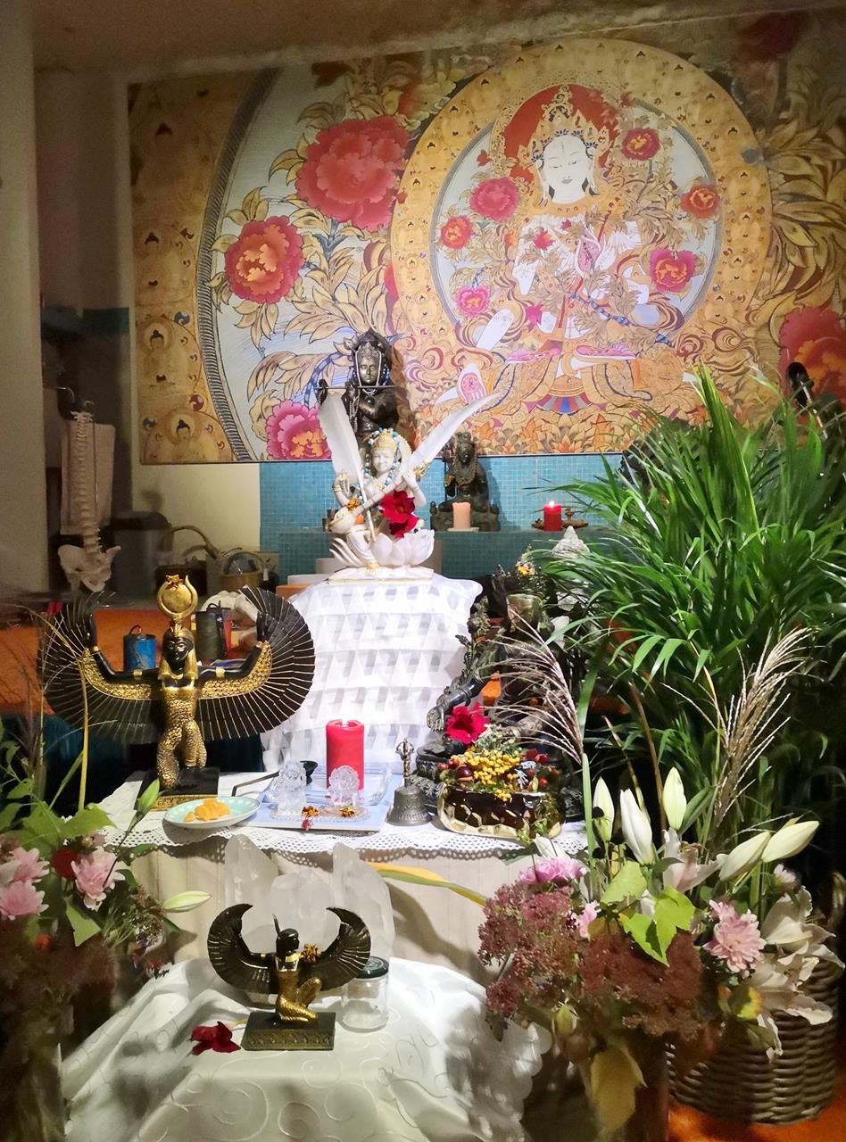 gensingen_okt_2021_002_948x1280 ← Zurück Weiter → Altar im großen Yogaraum bei der Navaratri-Feier vor dem Bildhnis der buddhistischen Göttin Tara