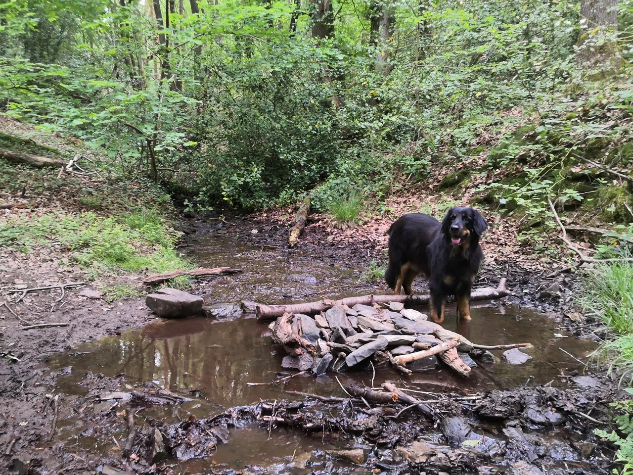 Endlich findet Doxi eine Trinkstelle im Wald