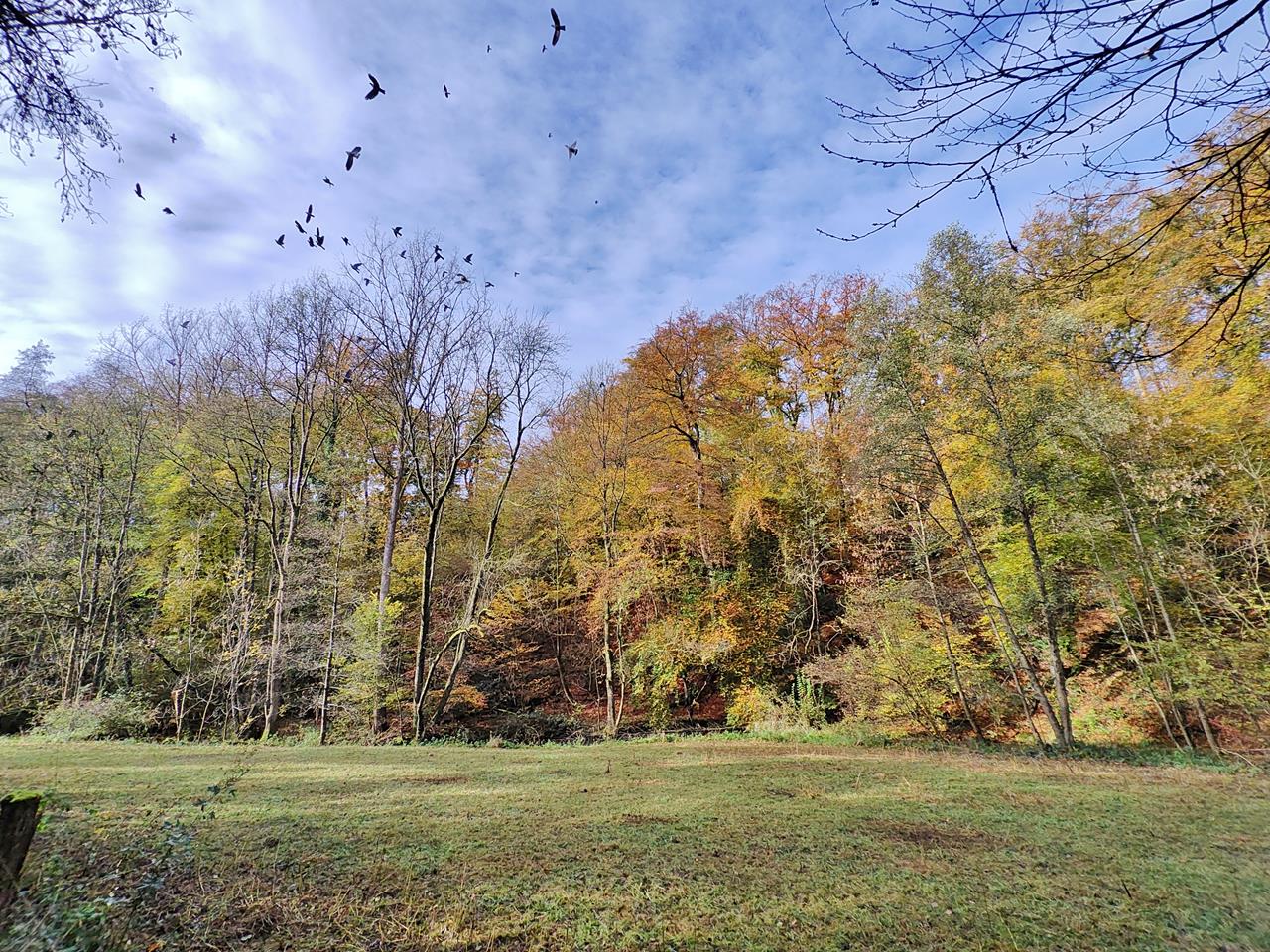 Vogelschwarm über einer Weide an der Düssel