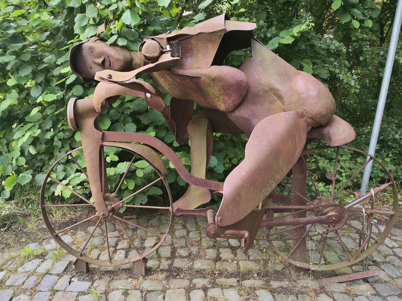 Eisenskulptur „Radfahrer“ von Joe Siewe am See