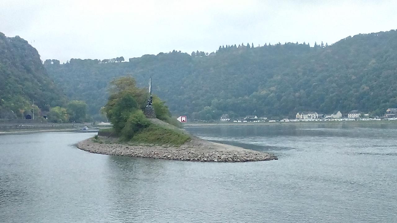 Loreleyfigur unterhalb des Loreleyfelsens auf einer kleinen Insel im Rheinstrom