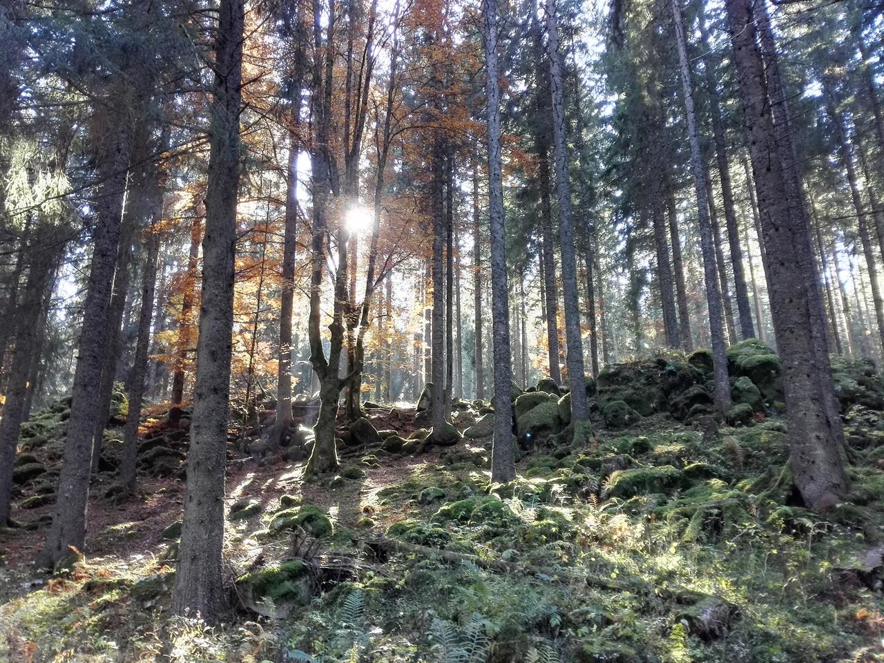 Die Sonne strahlt zwischen den Bäumen hindurch
