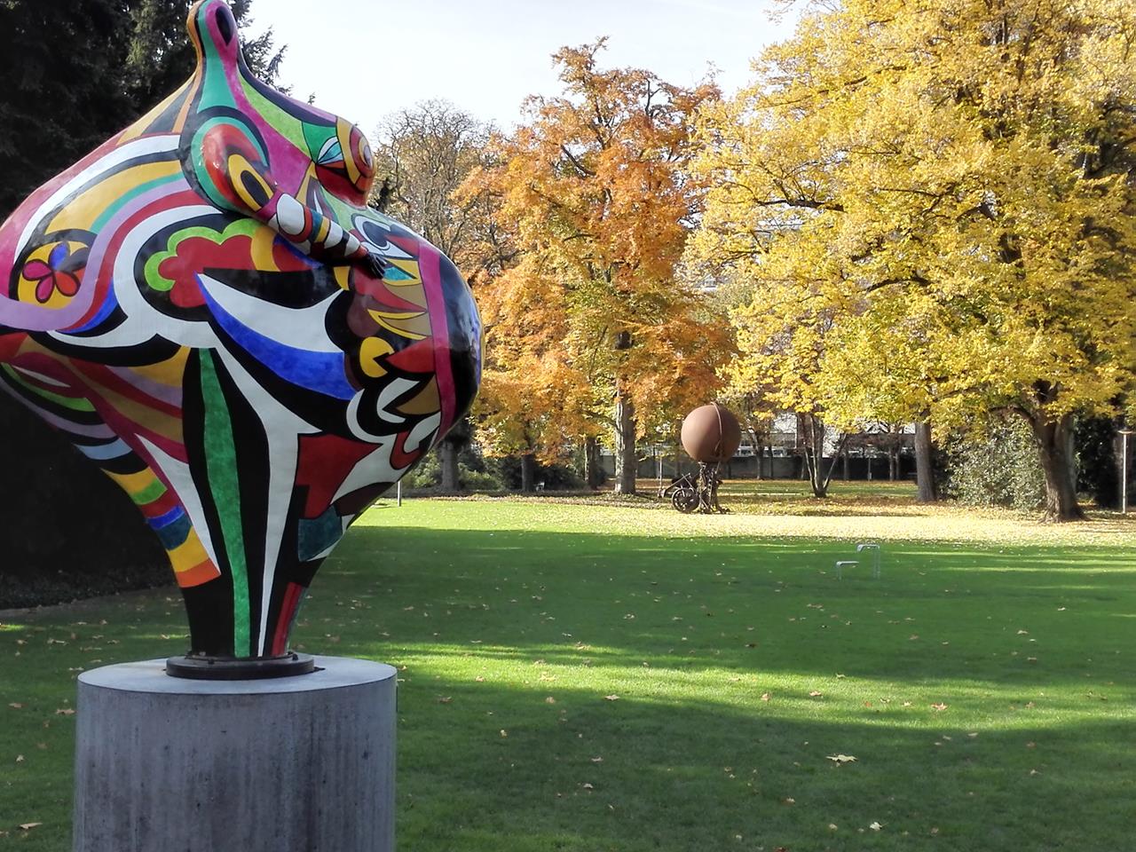 ← Zurück Weiter → Vor eine Skulptur von Tinguelys Lebensgefährtin Nikki de Saint-Phalle, hinten eine Plastik von Tinguely