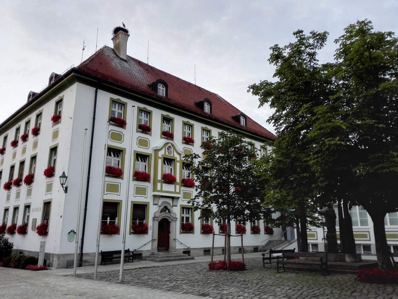 Das Rathaus von Bad Kötzting. Oben versorgt ein Storchenpaar seinen Nachwuchs.