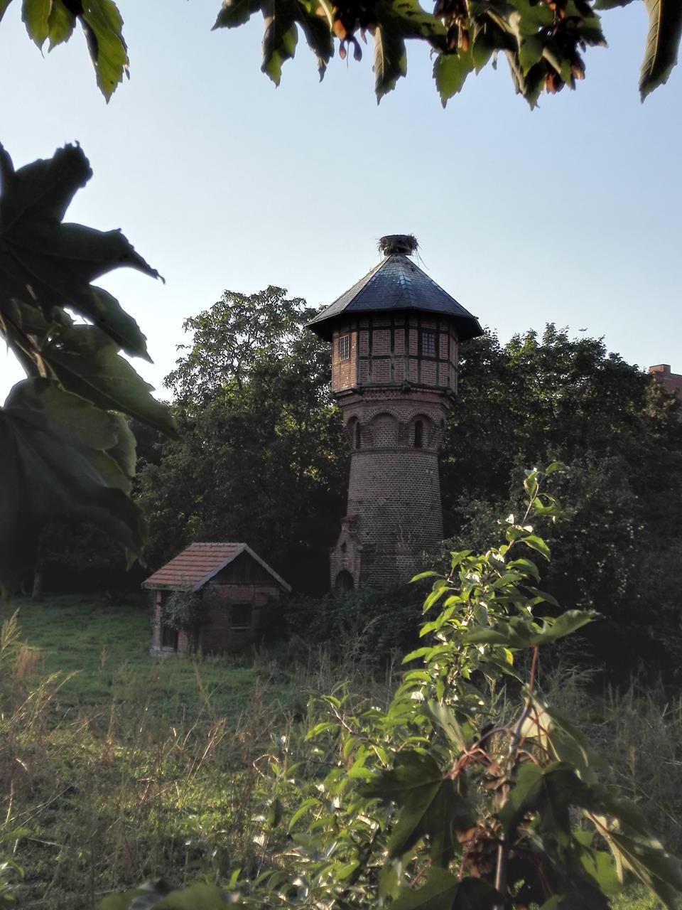 Storchennest auf dem alten Wasserturm des Ortes