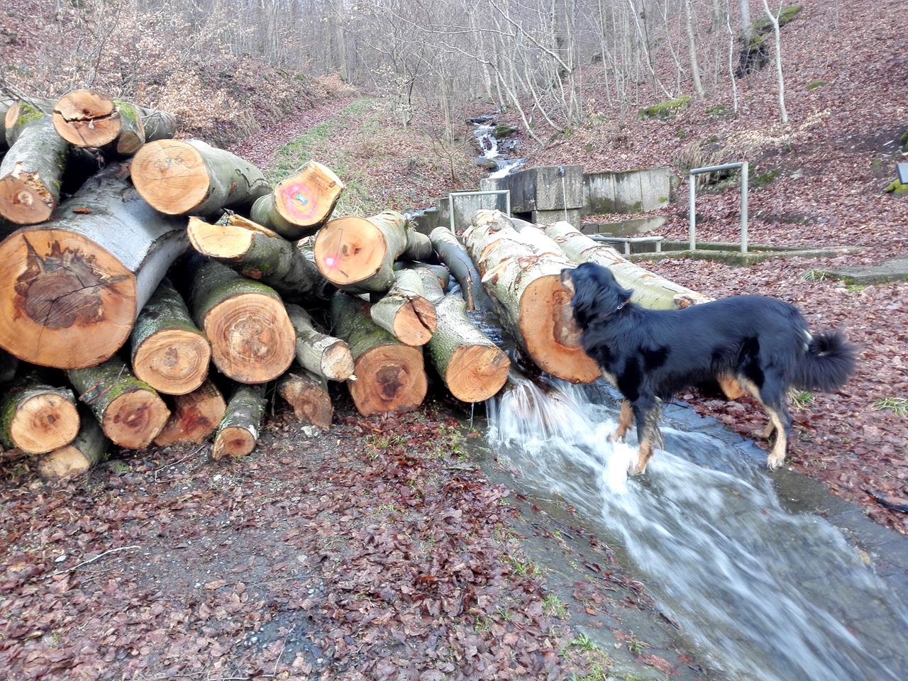März 2017: Baumstämme in einem Bachbett im Westerwald