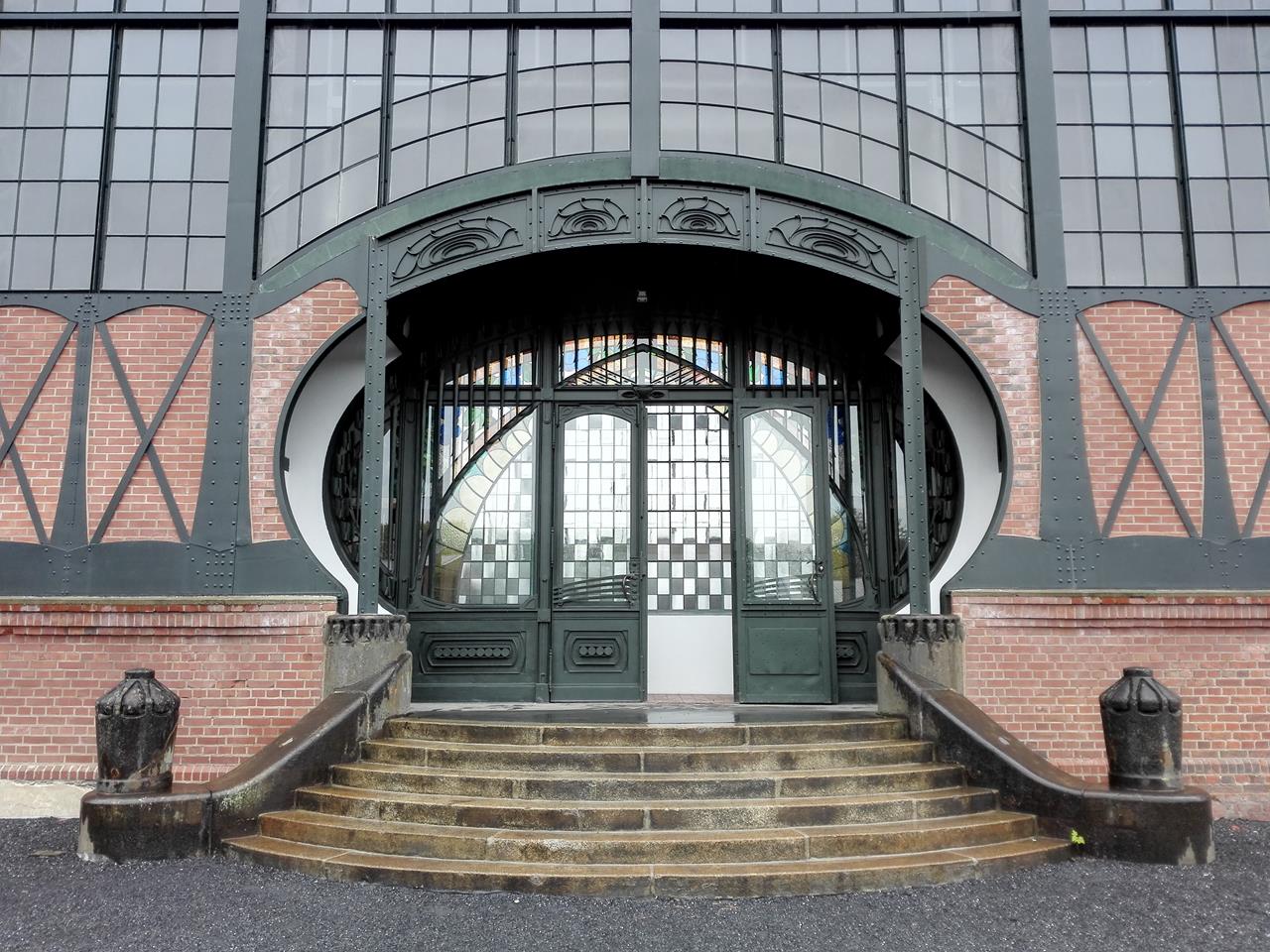 Der Eingang zur Maschinenhalle in Jugendstil-Optik von der Außenseite