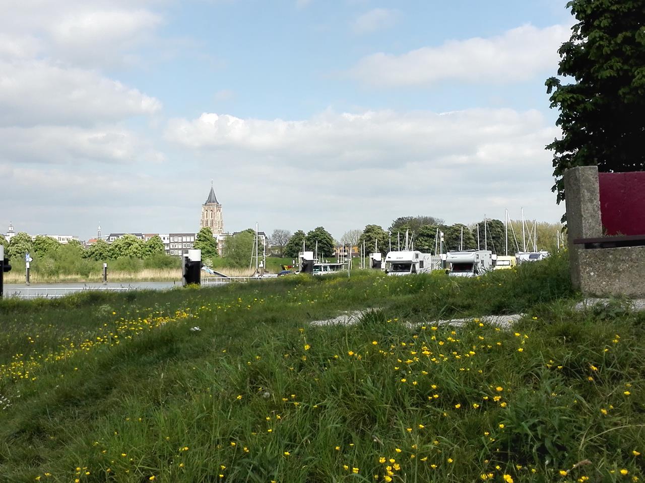 Blick zu den Wohnmobilen, dahinter der Kirchturm von Gorinchem
