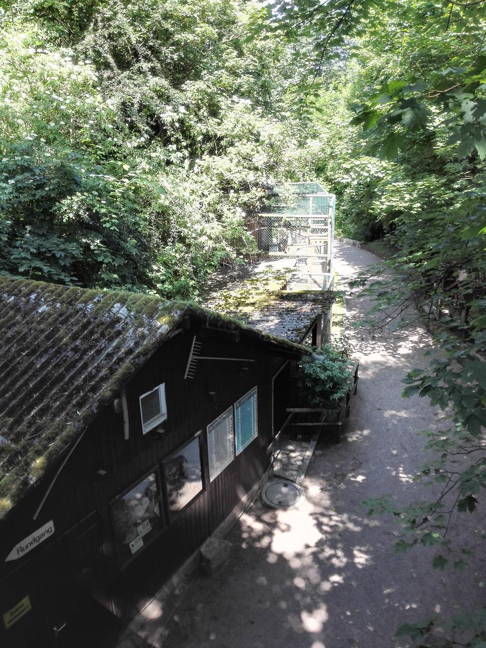 Vogelvolieren mit Greifvögeln im Burggraben von Burg Hohenbeilstein