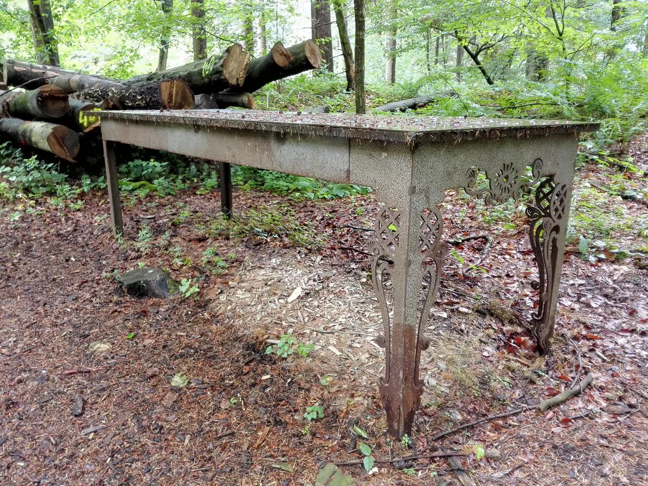 Kunstwerk im Wald als Symbol für die Trennung von Arm (einfache hölzerne Tischbeine, links) und Reich (aufwändig gearbeitete metallene Tischbeine, rechts)