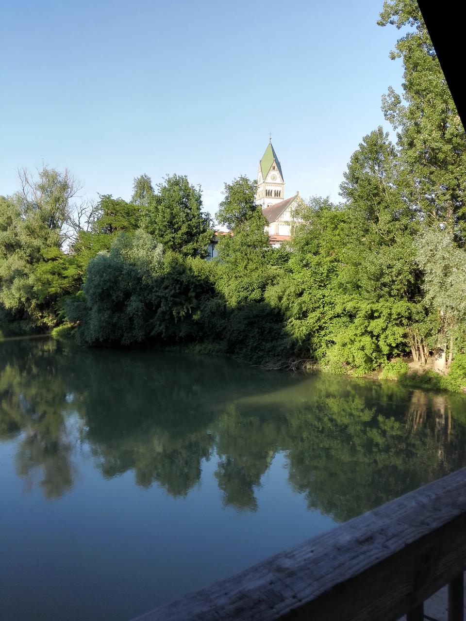 ← Zurück Weiter → Blick von der Brücke in nördlicher Richtung über den Altrhein zur kath. Pfarrkirche von Ketsch