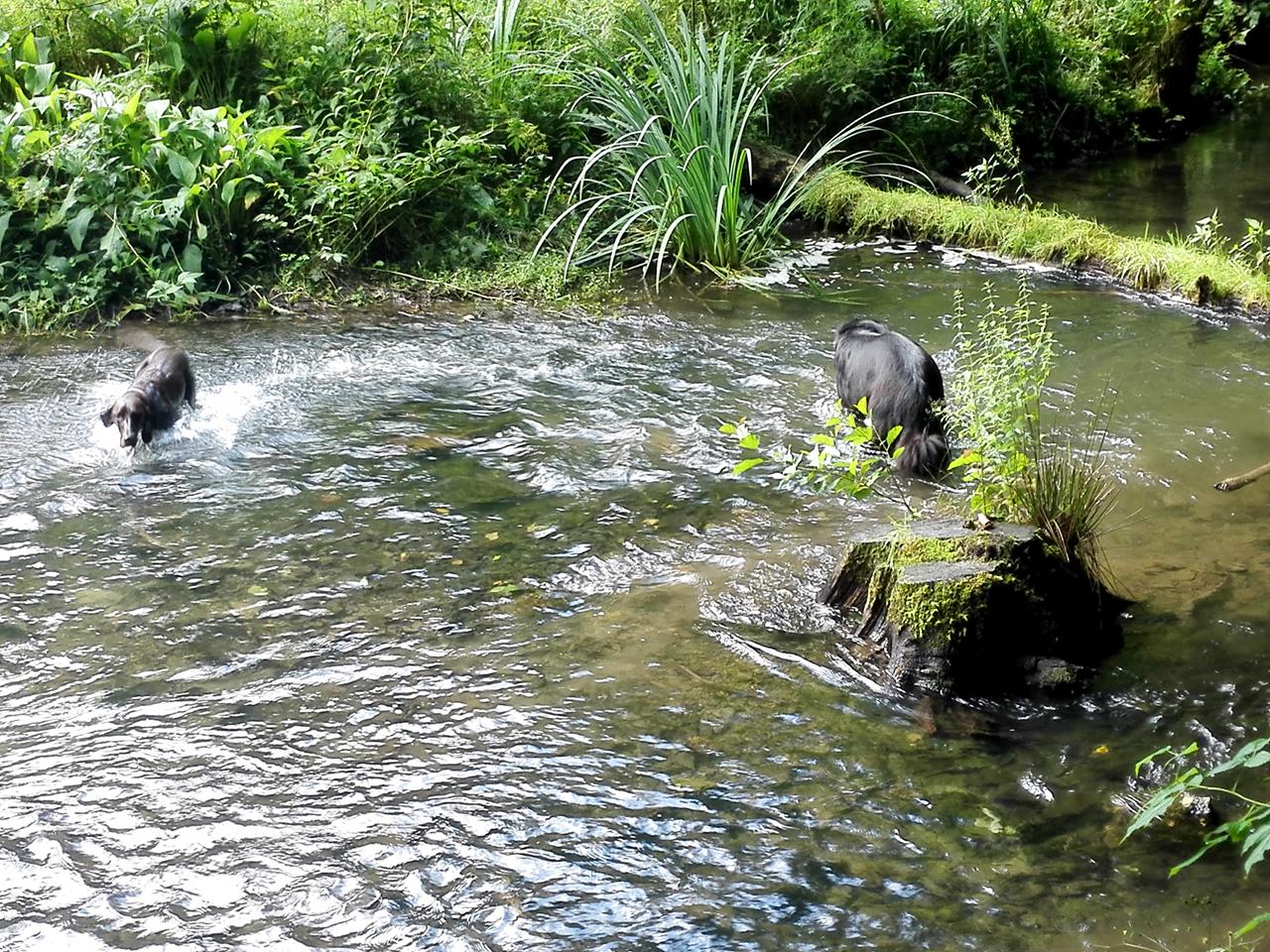 Doxi und Donna auf der Suche nach ihrem Stöckchen in der Dhünn