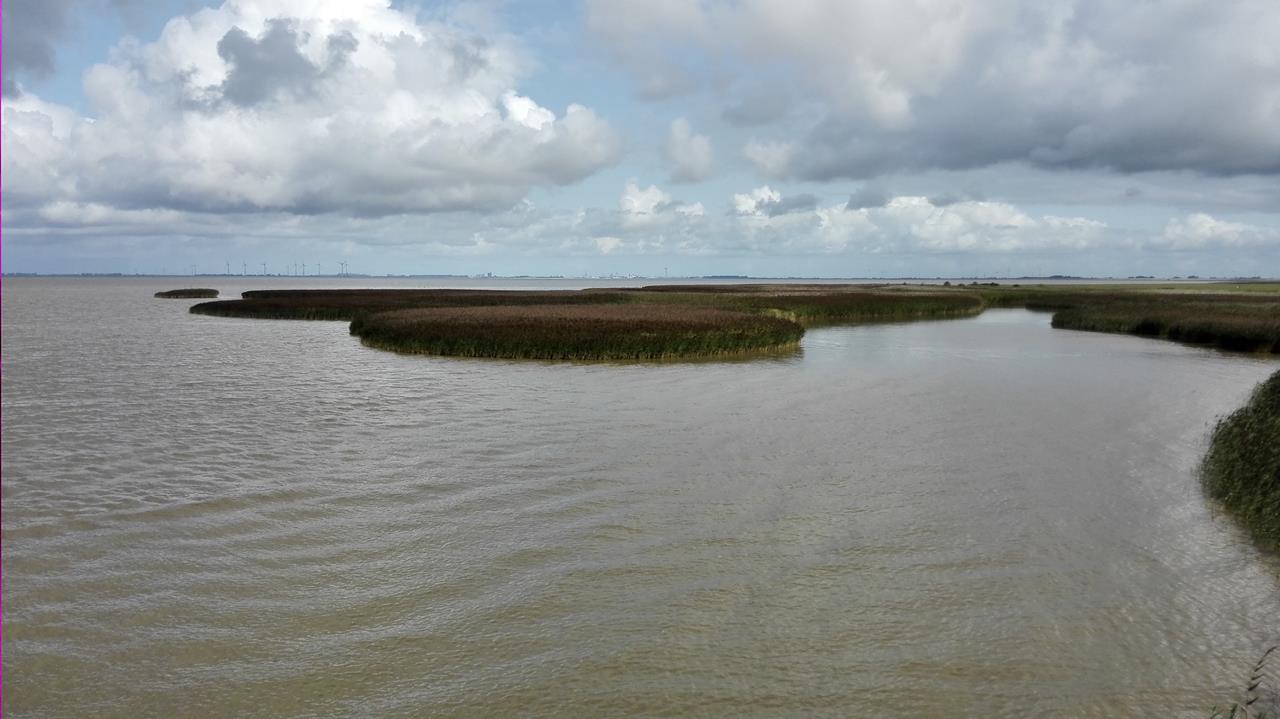 Links und rechts erstrecken sich am Rande des Watts ausgeprägte Schilfgürtel