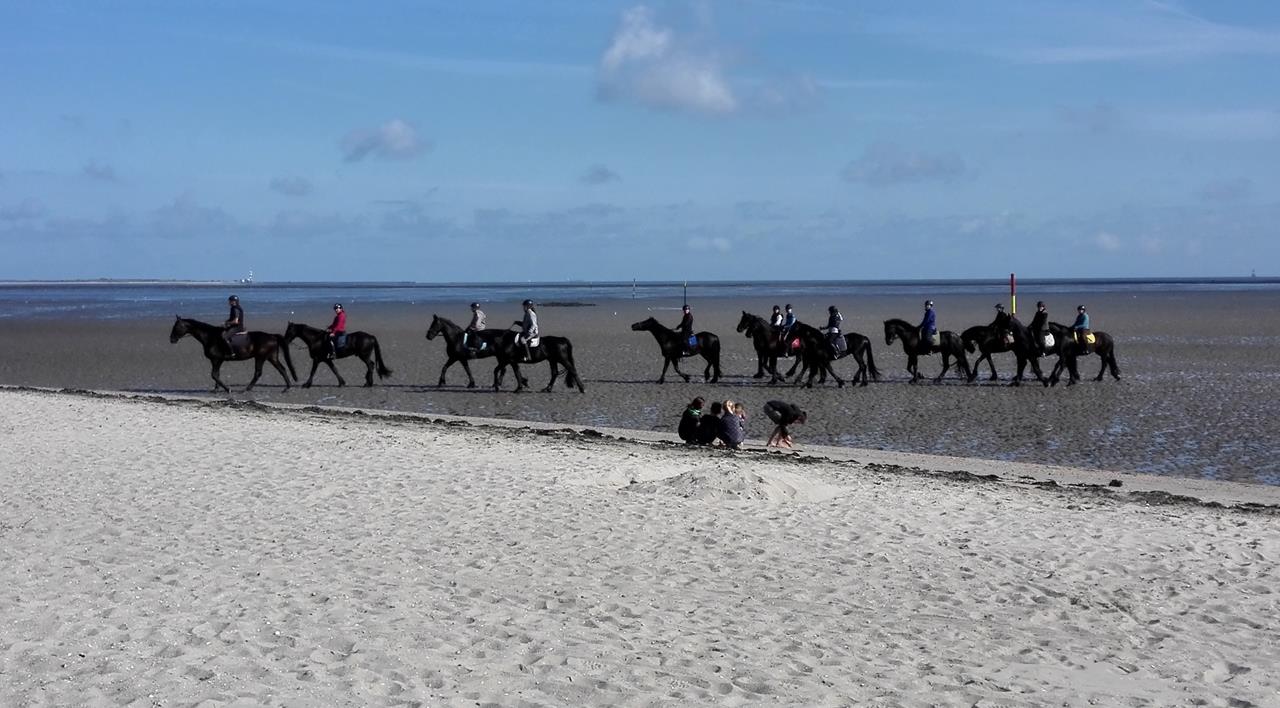 Diese Reitergruppe kommt gerade aus dem Watt zurück
