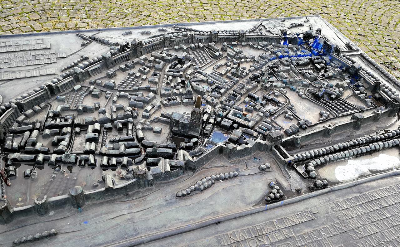 Bronzemodell der historischen Altstadt von Duisburg am heutigen Innenhafen