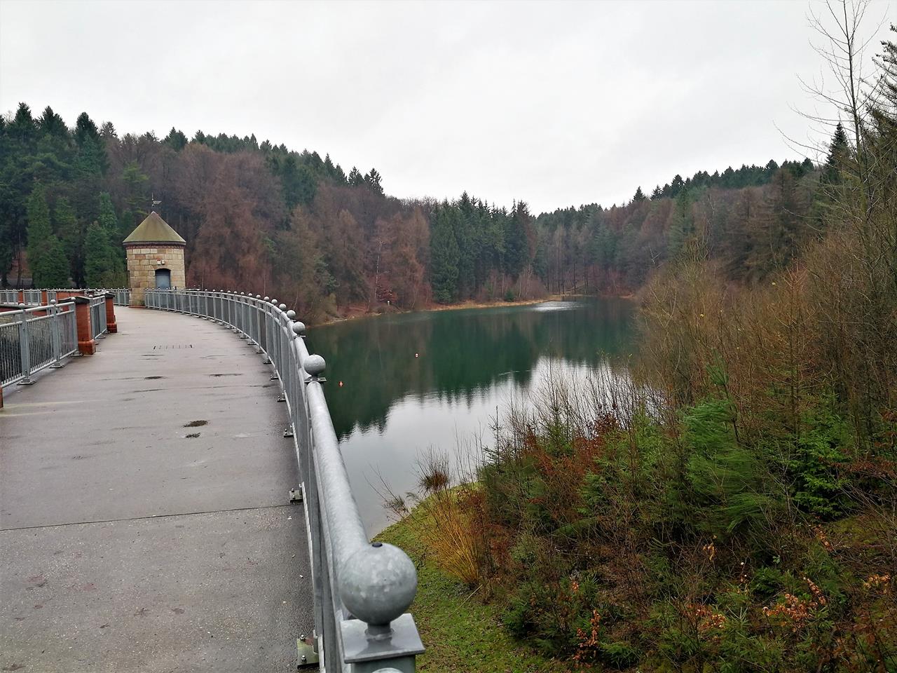 Blick auf die Staumauer und den Aufstau des Saalbachs