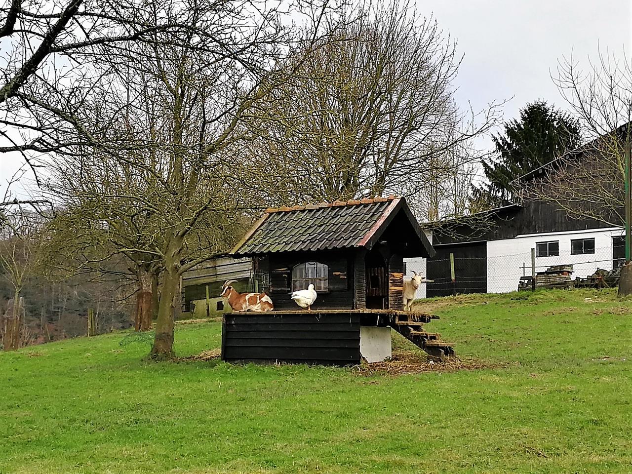 Gans und Ziegen vereint auf einem Bauernhof am Ortseingang von Leysiefen