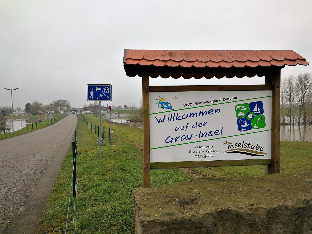 Eingang zum Campingplatz Grav-Insel am Flürer Altrheinarm