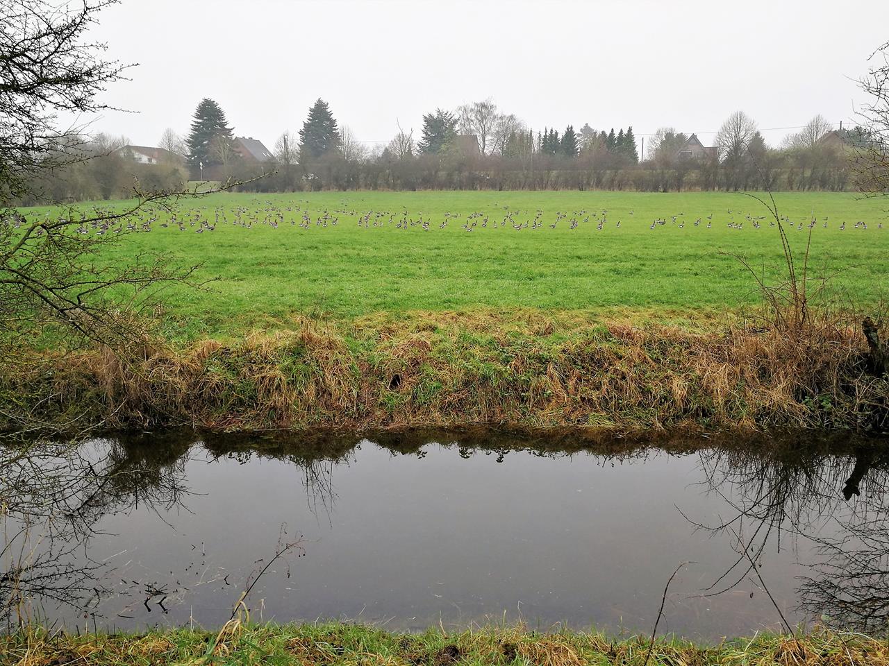 Hunderte von Wildgänsen auf den Wiesen zwischen dem See und Flüren
